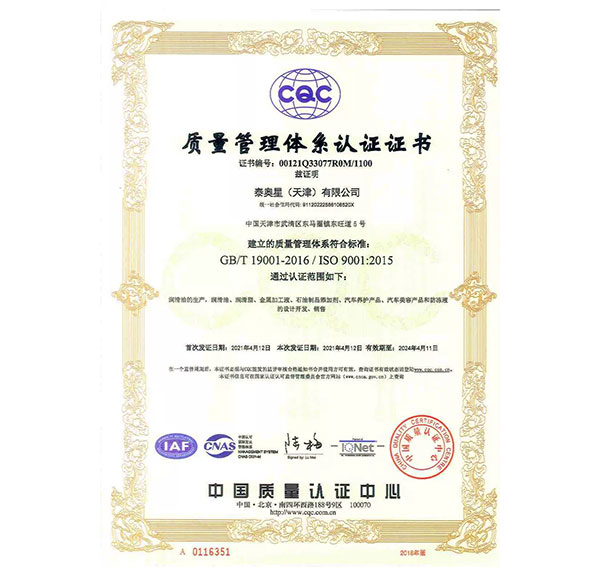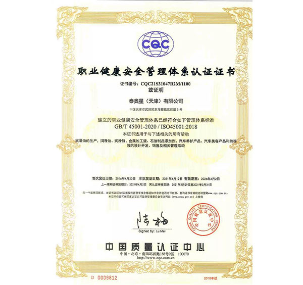 多年來,泰奧星堅(jiān)持質(zhì)量至上的經(jīng)營(yíng)理念,先后通過了ISO9001質(zhì)量管理體系、ISO14001環(huán)境管理體系和、OHSAS18001職業(yè)健康安全管理體系及IATF16949質(zhì)量管理體系四大體系認(rèn)證。嚴(yán)格的質(zhì)量控制體系保障了公司產(chǎn)品質(zhì)量穩(wěn)定優(yōu)良,近年來,泰奧星先后被認(rèn)定為CMMC中國(guó)潤(rùn)滑材料行業(yè)十強(qiáng)、全國(guó)潤(rùn)滑十佳企業(yè)、中國(guó)綠色低碳先鋒企業(yè)等。