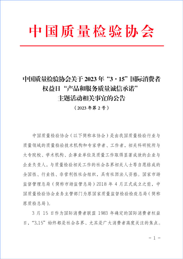 中國質(zhì)量檢驗(yàn)協(xié)會關(guān)于組織開展2023年“3·15”活動(dòng)的公告(2023年第2號)