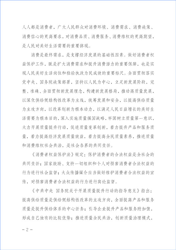 消費(fèi)是最終需求,是支撐經(jīng)濟(jì)發(fā)展的基礎(chǔ)性因素。做好消費(fèi)者權(quán)益保護(hù)工作,既是擴(kuò)大消費(fèi)需求和提升消費(fèi)潛力的重要保障,也是實(shí)現(xiàn)人民美好生活向往和檢驗(yàn)執(zhí)政為民成效的重要標(biāo)尺。全面貫徹落實(shí)黨中央、國務(wù)院決策部署,堅(jiān)持以人民為中心,立足新發(fā)展階段,完整、準(zhǔn)確、全面貫徹新發(fā)展理念,構(gòu)建新發(fā)展格局,推動(dòng)高質(zhì)量發(fā)展,以深化供給側(cè)結(jié)構(gòu)性改革為主線,統(tǒng)籌發(fā)展和安全,以提高供給質(zhì)量為主攻方向,以改革創(chuàng)新為根本動(dòng)力,以滿足人民日益增長的美好生活需要為根本目的,深入實(shí)施質(zhì)量強(qiáng)國戰(zhàn)略,牢固樹立質(zhì)量第一意識,大力開展質(zhì)量提升行動(dòng),促進(jìn)質(zhì)量變革創(chuàng)新,著力提升產(chǎn)品和服務(wù)質(zhì)量,著力提高經(jīng)濟(jì)發(fā)展質(zhì)量效益,著力提高全民質(zhì)量素養(yǎng),推進(jìn)質(zhì)量和消費(fèi)維權(quán)社會共治,是社會各界的共同責(zé)任。