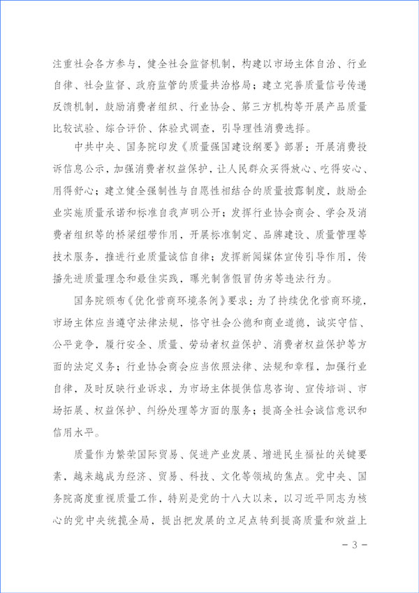 質(zhì)量是人類生產(chǎn)生活的重要保障。為努力開創(chuàng)質(zhì)量專業(yè)社團(tuán)組織在新時(shí)代的新作用,大力推動(dòng)經(jīng)營者質(zhì)量誠信自律,切實(shí)維護(hù)消費(fèi)者合法權(quán)益,積極督促企業(yè)承諾產(chǎn)品和服務(wù)質(zhì)量主體責(zé)任,強(qiáng)化引領(lǐng)企業(yè)履行產(chǎn)品和服務(wù)質(zhì)量誠信承諾,切實(shí)營造公平競爭的市場環(huán)境和安全放心的消費(fèi)環(huán)境,進(jìn)一步充分發(fā)揮質(zhì)量檢驗(yàn)行業(yè)社團(tuán)組織和質(zhì)量專業(yè)社團(tuán)機(jī)構(gòu)在持續(xù)優(yōu)化營商環(huán)境、充分激發(fā)各類市場主體活力的橋梁紐帶作用,助力保障人民群眾享有高品質(zhì)生活,本協(xié)會決定按照章程賦予的職能職責(zé),繼續(xù)在2023年“3·15”國際消費(fèi)者權(quán)益日活動(dòng)中組織廣大重質(zhì)量、講誠信的優(yōu)秀企業(yè)開展“產(chǎn)品和服務(wù)質(zhì)量誠信承諾”主題活動(dòng),營造政府重視質(zhì)量、企業(yè)追求質(zhì)量、社會崇尚質(zhì)量、人人關(guān)心質(zhì)量的良好氛圍。