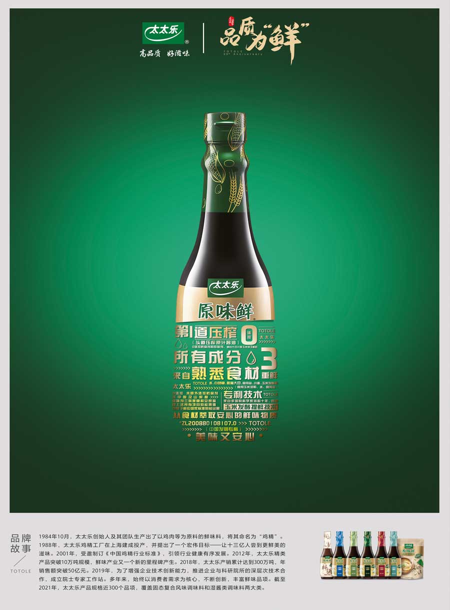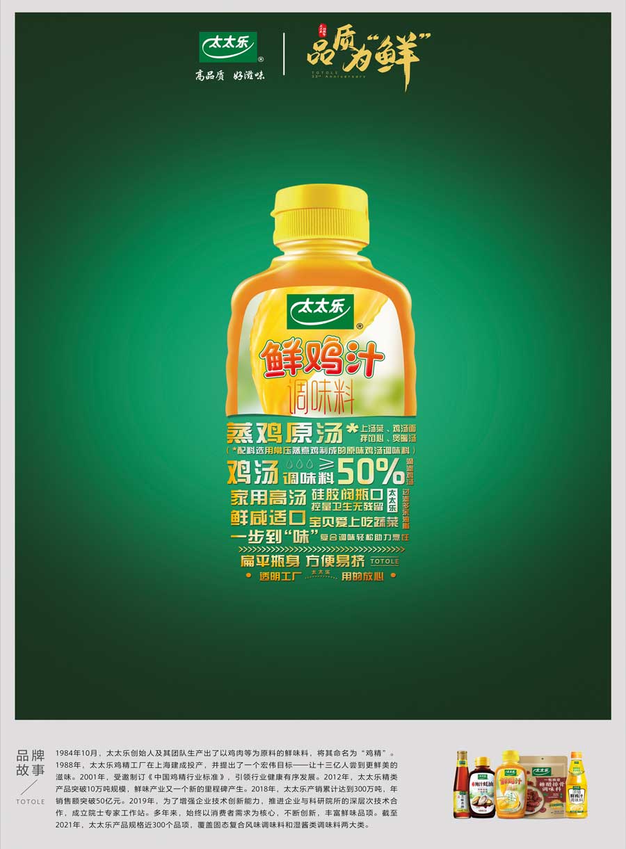 上海太太樂(lè)食品有限公司創(chuàng)立于1988年,中國(guó)雞精、雞粉行業(yè)標(biāo)準(zhǔn)制定單位之一,并于1999年加入世界知名的食品飲料公司瑞士雀巢,充分利用國(guó)際資源加速產(chǎn)品和技術(shù)研發(fā)。秉承“太太樂(lè),讓生活更美好”的企業(yè)愿景,太太樂(lè)一直致力于鮮味科學(xué)的研究和推廣,帶動(dòng)鮮味產(chǎn)業(yè)的技術(shù)創(chuàng)新,不斷為消費(fèi)者帶來(lái)健康又美味的新一代調(diào)味品。