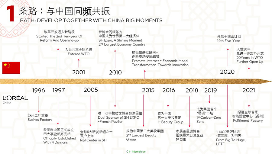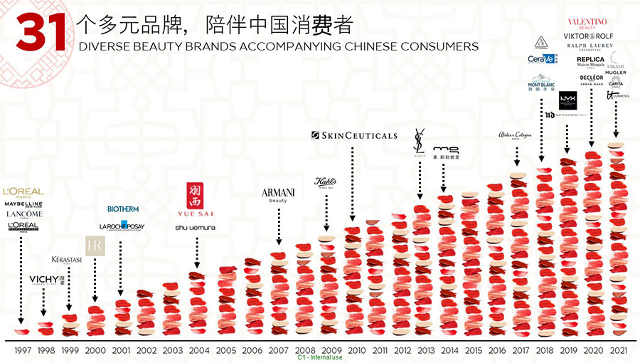 歐萊雅在1997年進(jìn)入中國。歐萊雅中國的總部位于上海,并在全國設(shè)有五個(gè)辦事處,目前在中國擁有31個(gè)品牌,一個(gè)研發(fā)和創(chuàng)新中心,兩家工廠分別位于蘇州和宜昌,共有超過14,000名員工。經(jīng)過25年高質(zhì)量、穩(wěn)健、可持續(xù)的增長,中國已成為歐萊雅集團(tuán)全球第二大市場,該集團(tuán)北亞區(qū)美妝黃金三角洲的總部,以及該集團(tuán)美妝科技三大樞紐之一。作為中國最佳企業(yè)公民之一,歐萊雅中國始終貫徹落實(shí)該集團(tuán)提出的“歐萊雅,為明天——可持續(xù)發(fā)展承諾2030”,是該集團(tuán)第1個(gè)完整運(yùn)營設(shè)施“零碳”的市場,并積極通過社會責(zé)任項(xiàng)目,持續(xù)貢獻(xiàn)中國社會的美好發(fā)展。