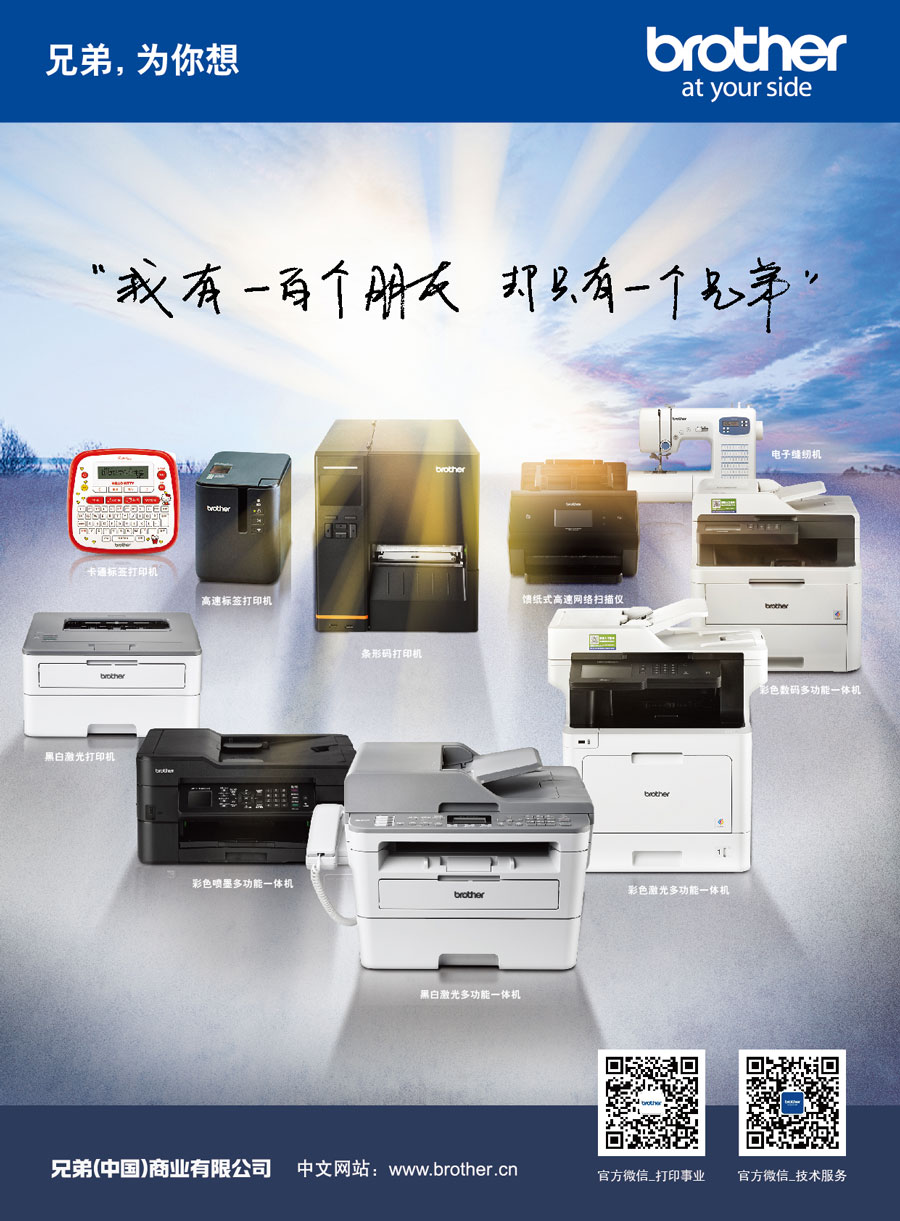 Brother作為擁有110多年歷史的國(guó)際化品牌,目前已在全球40個(gè)以上的國(guó)家和地區(qū)擁有研究開發(fā)基地、生產(chǎn)基地以及銷售公司。作為Brother集團(tuán)在中國(guó)的產(chǎn)品銷售與服務(wù)的外商獨(dú)資企業(yè),兄弟(中國(guó))充分利用集團(tuán)的資源優(yōu)勢(shì),秉承“At your side.”的企業(yè)文化理念,遵循顧客第一的宗旨,傾聽顧客的呼聲,為中國(guó)消費(fèi)者提供更多具有高附加值的產(chǎn)品和服務(wù)。兄弟(中國(guó))的事業(yè)領(lǐng)域包括以打印機(jī)、多功能一體機(jī)、傳真機(jī)、標(biāo)簽打印機(jī)、掃描儀等產(chǎn)品為代表的打印及解決方案事業(yè);以家用縫紉機(jī)、商用繡花機(jī)、電腦花樣裁切機(jī)為中心的家用機(jī)器事業(yè)。