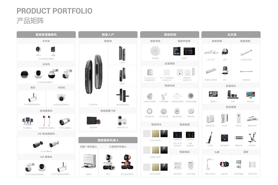 主要產(chǎn)品:螢石(EZVIZ)智能家居攝像機(jī)、智能入戶、智能服務(wù)機(jī)器人、智能控制、螢石物聯(lián)云平臺
