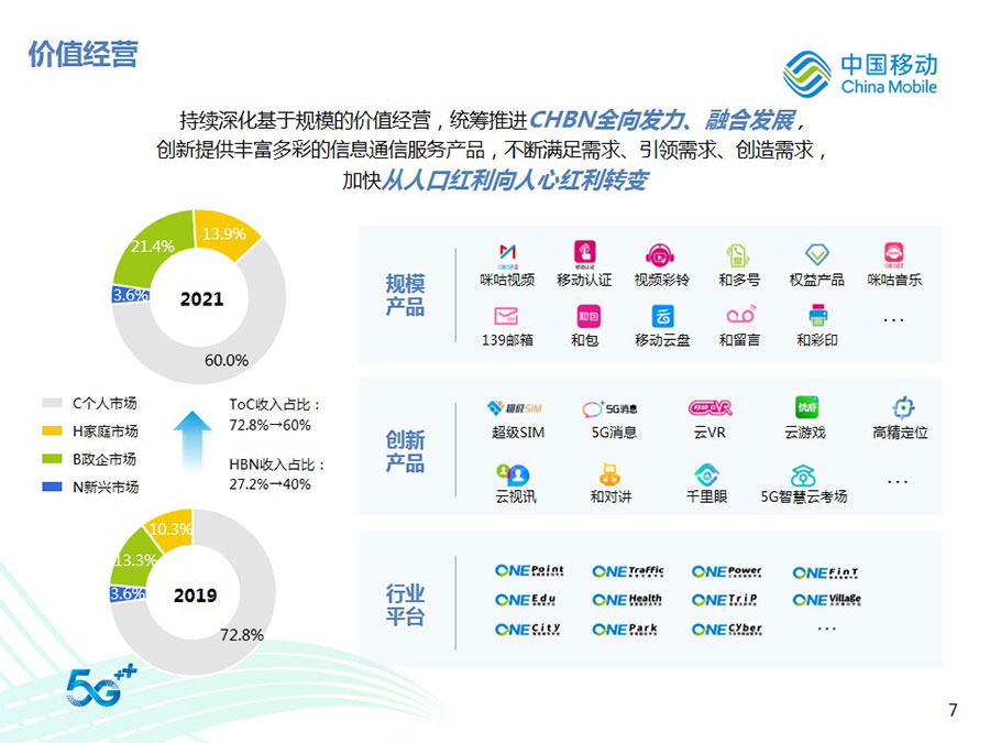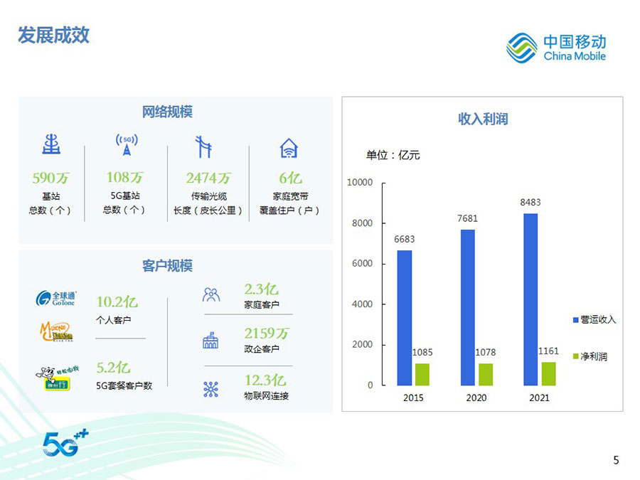 2022年,中國移動全年營運(yùn)收入達(dá)到人民幣9,373億元,同比增長10.5%,其中通信服務(wù)收入達(dá)到人民幣8,121億元,同比增長8.1%。CHBN客戶規(guī)模、收入規(guī)模全面增長,HBN收入占通信服務(wù)收入比達(dá)到39.8%,同比提升4.1個百分點(diǎn)。得益于5G應(yīng)用、移動云、數(shù)字內(nèi)容、智慧家庭等業(yè)務(wù)的快速拓展,數(shù)字化轉(zhuǎn)型收入達(dá)到人民幣2,076億元,同比增長30.3%。整體來看,公司著力打造的數(shù)字化轉(zhuǎn)型收入增長“第二曲線”卓有成效,收入結(jié)構(gòu)更加均衡穩(wěn)健,可持續(xù)增長動能不斷增強(qiáng),抗風(fēng)險能力顯著提升。