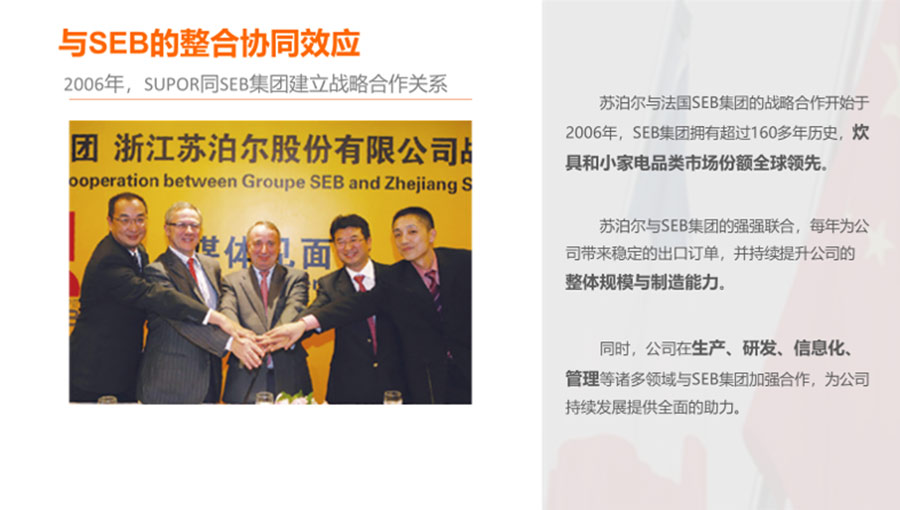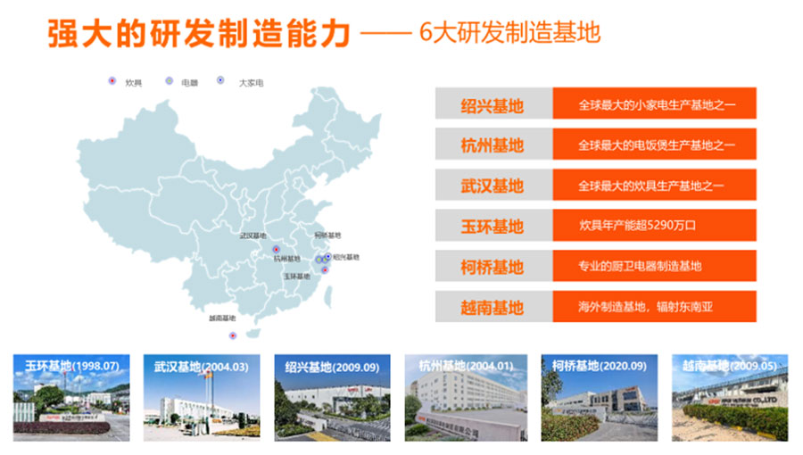 浙江蘇泊爾股份有限公司是中國最大、全球第二的炊具研發(fā)制造商之一,中國廚房小家電領(lǐng)先品牌。在杭州、玉環(huán)、紹興、武漢和越南建立了5大研發(fā)制造基地,擁有1萬多名員工。蘇泊爾是中國炊具行業(yè)首家上市公司(股票代碼002032)。浙江蘇泊爾家電制造有限公司是浙江蘇泊爾股份有限公司的控股子公司,注冊資本13369萬元,自2004年1月成立,主要生產(chǎn)電飯煲、電蒸鍋、電燉鍋、煎烤器等廚房小家電產(chǎn)品。2023年?duì)I收達(dá)到40.83億元,擁有2100多名員工,目前為中國最大的電飯煲生產(chǎn)基地之一。
