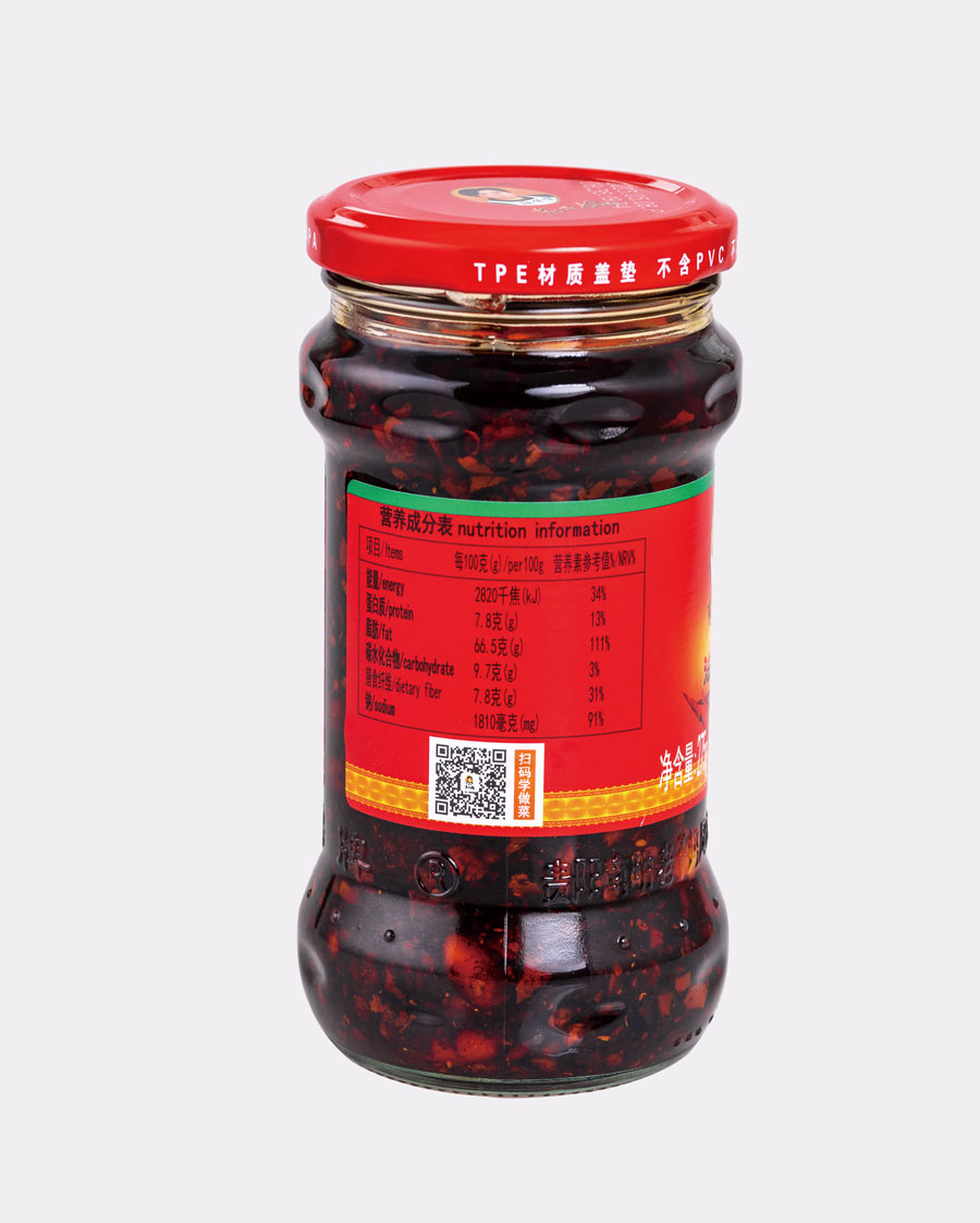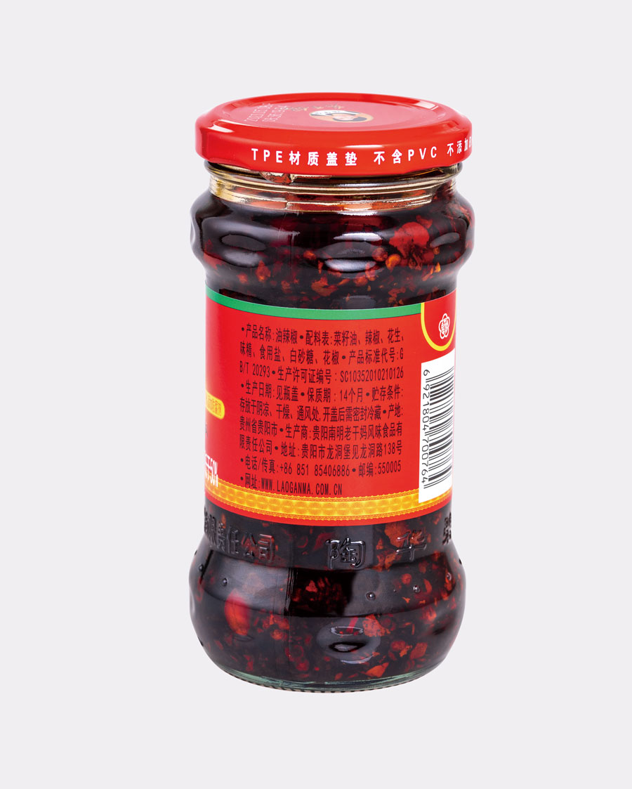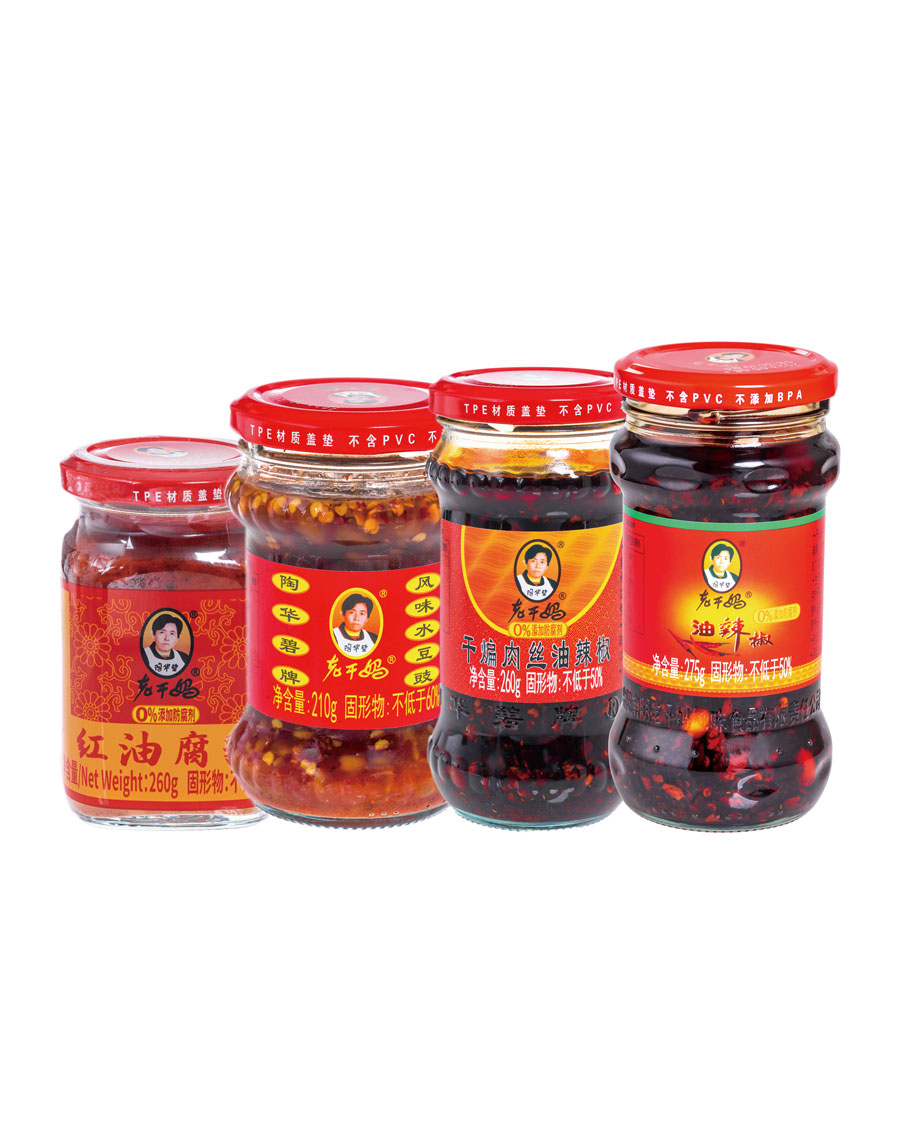 主要產品:老干媽牌油辣椒系列(油辣椒、風味豆豉、香菇、精制牛肉末豆豉、辣三丁、香辣脆、干煸肉絲、風味雞、肉絲豆豉)、油辣子大塊牛肉醬、火鍋底料(糟辣椒/植物油)、香辣醬、下飯菜、拌飯醬、風味水豆豉、紅油腐乳、風味腐乳、香辣菜、糟辣剁椒系列(姜蒜/中辣/微辣)、番茄辣醬