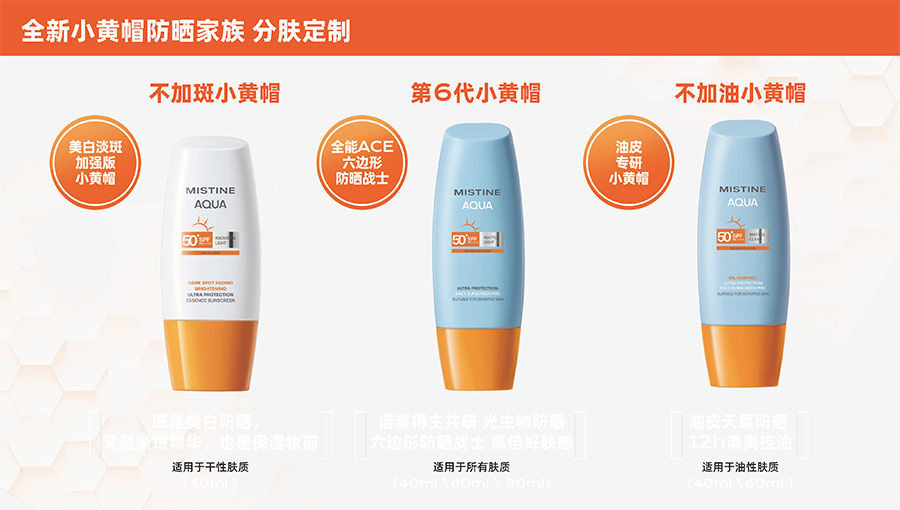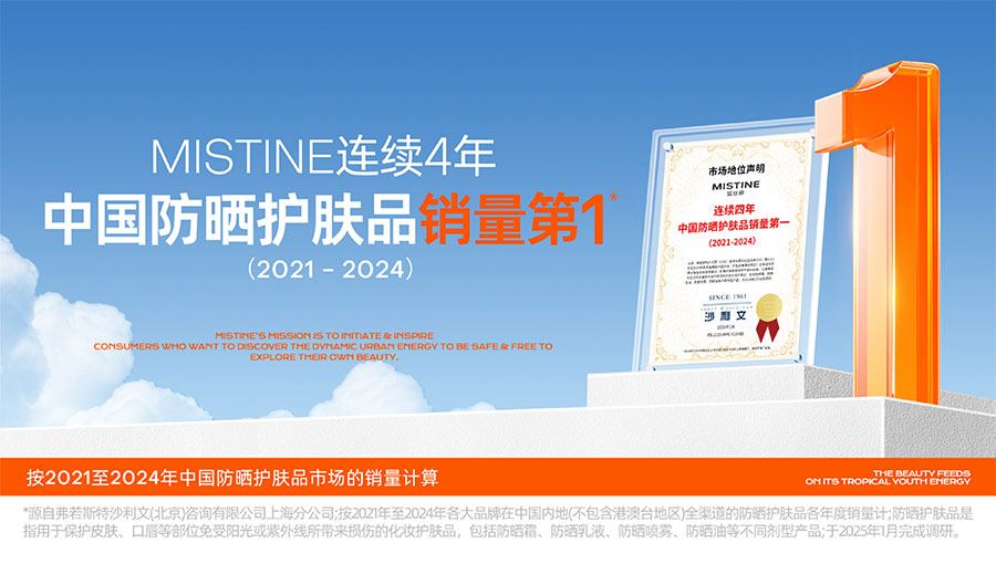 歷經(jīng)37年的科研沉淀,MISTINE蜜絲婷品牌在防曬、護(hù)膚、底妝、彩妝多個(gè)品類的產(chǎn)品開發(fā)中,堅(jiān)持圍繞對(duì)“光”的研究,在光與防曬護(hù)膚、光與色彩妝容的產(chǎn)品應(yīng)用層面,研究光、理解光、樂享光,持續(xù)不斷地提供產(chǎn)品解決方案,滿足消費(fèi)者對(duì)防曬美白、潮流妝容、護(hù)膚健康的需求。防曬系列產(chǎn)品作為MISTINE蜜絲婷的知名品類,以物化生一體的全鏈路防曬技術(shù),憑借高倍防曬、清爽膚感的高功效和高質(zhì)價(jià)比勝出,自2021年連續(xù)三年位于中國防曬護(hù)膚品銷量領(lǐng)先。
