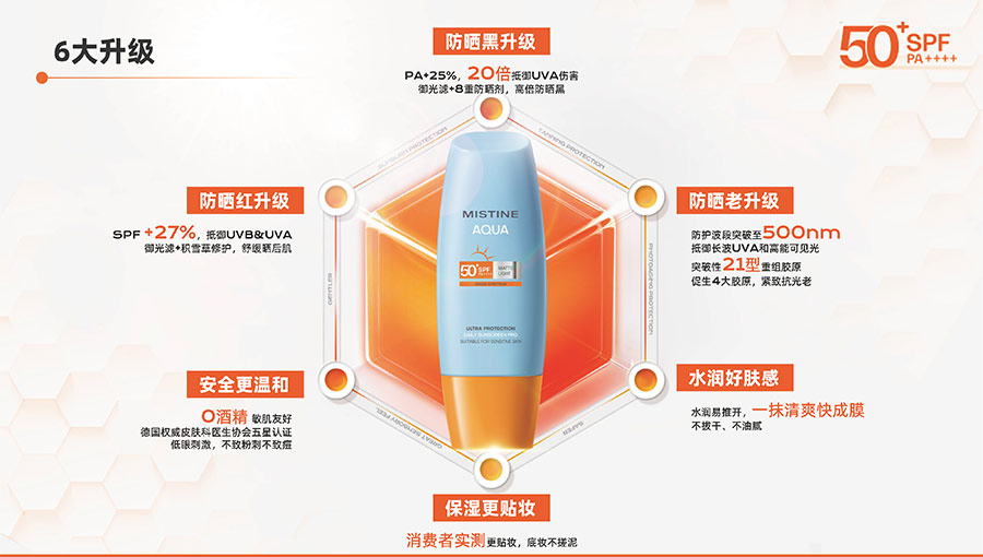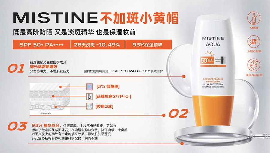 MISTINE蜜絲婷堅(jiān)持圍繞對(duì)“光”的研究,在光與防曬護(hù)膚、光與色彩妝容的產(chǎn)品應(yīng)用層面,研究光、理解光、樂享光,持續(xù)不斷地提供產(chǎn)品解決方案,滿足消費(fèi)者對(duì)防曬美白、潮流妝容、護(hù)膚健康的需求。