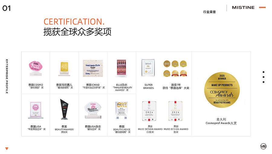 MISTINE蜜絲婷與眾多國際知名原料商、實(shí)驗(yàn)室展開針對(duì)功效護(hù)膚領(lǐng)域的諸多科學(xué)研究,搭建了全球六大創(chuàng)新聯(lián)合實(shí)驗(yàn)室及戰(zhàn)略合作伙伴關(guān)系。如全球最大的化學(xué)原材料供應(yīng)商巴斯夫、中國香港中文大學(xué)(深圳)瓦謝爾實(shí)驗(yàn)室等,通過整合全球行業(yè)頂尖優(yōu)質(zhì)的資源及原料、技術(shù)、研發(fā)三方協(xié)同合作,為消費(fèi)者打造優(yōu)質(zhì)產(chǎn)品。