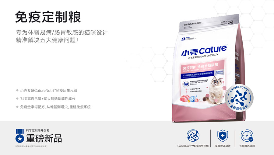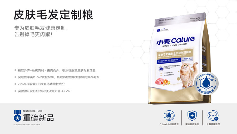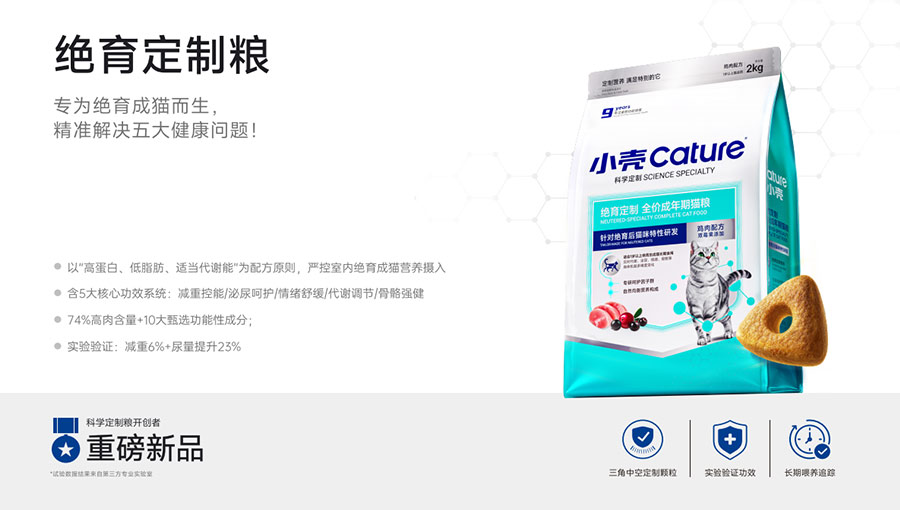 主要產(chǎn)品:小殼絕育定制糧,小殼皮膚毛發(fā)定制糧,小殼免疫呵護(hù)定制糧,小殼功能主食罐系列(小殼排毛主食罐,小殼魚(yú)油主食罐),小殼小輕松凍干棒系列(小殼貓草棒pro,小殼魚(yú)油棒pro)
