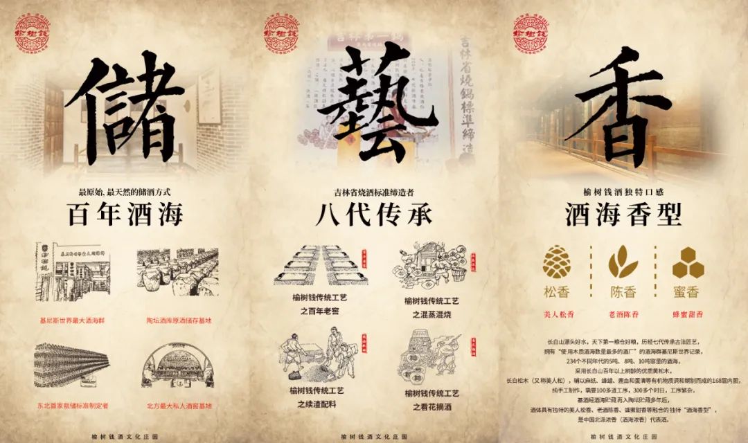 好的品牌需要好的品質(zhì)作為支撐。長(zhǎng)白山源頭好水,天下第一糧倉(cāng)好糧,歷經(jīng)八代傳承古法匠藝,234個(gè)不同年代的酒海,采用長(zhǎng)白山百年以上樹(shù)齡的優(yōu)質(zhì)黃松木,長(zhǎng)白松木(又稱(chēng)美人松),輔以麻紙、蜂蠟、鹿血和蛋清等有機(jī)物質(zhì)調(diào)和糊制而成的168層內(nèi)膽,純手工制作,需要100多道工序,300多個(gè)時(shí)日,工序繁雜,基酒經(jīng)酒海貯藏再入陶壇貯藏多年后,酒體則具有獨(dú)特的美人松香、老酒陳香、蜂蜜甜香,是榆樹(shù)錢(qián)酒業(yè)獨(dú)特的“酒海香型”。