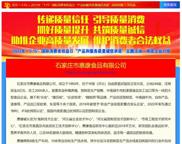傳遞質(zhì)量信任,引導(dǎo)質(zhì)量消費(fèi),近日,由中國質(zhì)量檢驗(yàn)協(xié)會(huì)主辦的2023年3·15國際消費(fèi)者權(quán)益日“產(chǎn)品和服務(wù)質(zhì)量誠信承諾”主題活動(dòng)順利召開。在本次活動(dòng)中,石家莊市惠康食品有限公司憑借優(yōu)質(zhì)的產(chǎn)品質(zhì)量及誠信經(jīng)營榮膺“全國產(chǎn)品和服務(wù)質(zhì)量誠信示范企業(yè)”,““全國預(yù)制菜行業(yè)質(zhì)量領(lǐng)先企業(yè) ”,公司旗下谷言預(yù)制菜系列產(chǎn)品榮獲“全國消費(fèi)者質(zhì)量信譽(yù)保障產(chǎn)品”榮譽(yù)。為營造公平、公正、誠信經(jīng)營的市場環(huán)境,樹立質(zhì)量標(biāo)桿、弘揚(yáng)質(zhì)量先進(jìn)做出了表率作用。