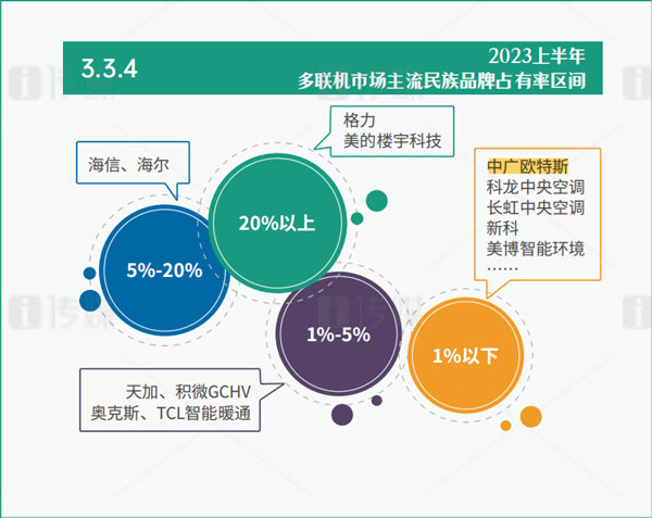 經(jīng)過(guò)多年的發(fā)展,中國(guó)中央空調(diào)市場(chǎng)的品牌格局基本穩(wěn)定。結(jié)合2023上半年各品牌的市場(chǎng)表現(xiàn),該報(bào)告將品牌出貨規(guī)模區(qū)位分為5大陣營(yíng),其中,中廣歐特斯在10億元以下規(guī)模榜上有名。
