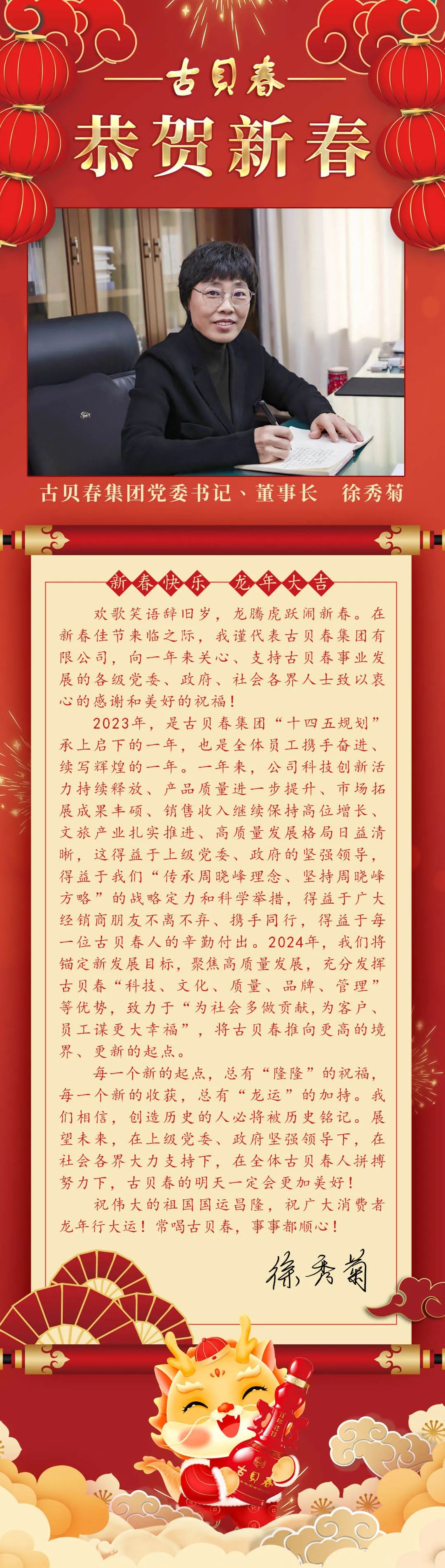 古貝春集團(tuán)有限公司黨委書記、董事長徐秀菊攜全體員工恭祝全國人民新春快樂!