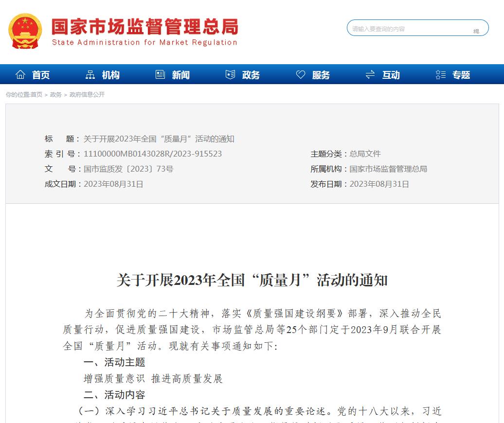 市場監(jiān)管總局等25個部門共同發(fā)布《關(guān)于開展2023年全國"質(zhì)量月"活動的通知》發(fā)布