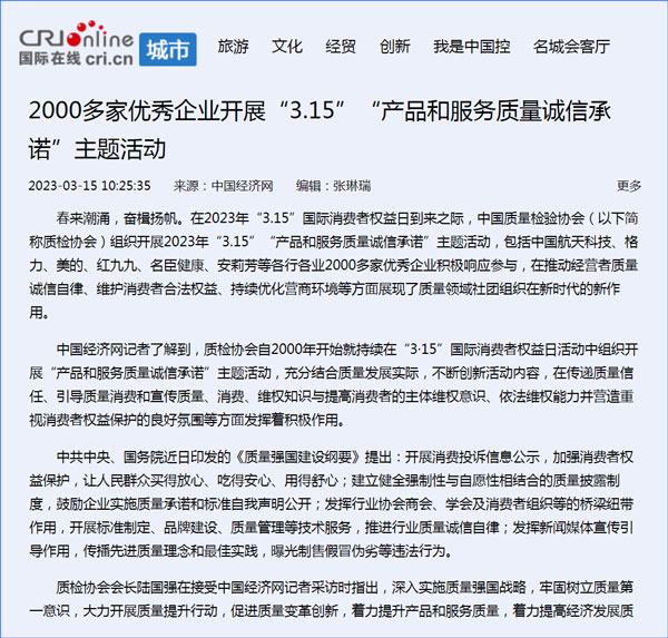 - 新華網(wǎng)發(fā)布:中國質(zhì)量檢驗協(xié)會開展2025年3·15“產(chǎn)品和服務(wù)質(zhì)量誠信承諾”主題活動…(2025-03-14)