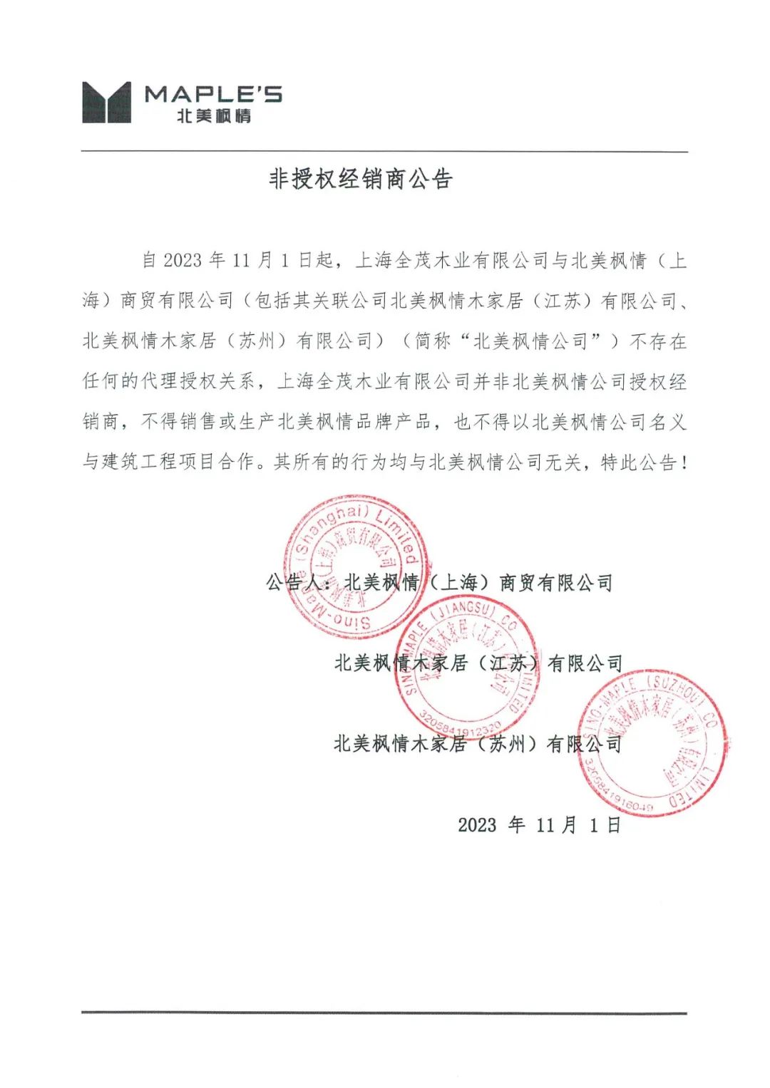 自2023年11月1日起,上海全茂木業(yè)有限公司與北美楓情 (上海)商貿(mào)有限公司(包括其關(guān)聯(lián)公司北美楓情木家居(江蘇)有限公司、北美楓情木家居(蘇州)有限公司)(《簡稱“北美楓情公司”)不存在任何的代理授權(quán)關(guān)系,上海全茂木業(yè)有限公司并非北美楓情公司授權(quán)經(jīng)銷商,不得銷售或生產(chǎn)北美楓情品牌產(chǎn)品,也不得以北美楓情公司名義與建筑工程項(xiàng)目合作。其所有的行為均與北美楓情公司無關(guān),特此公告!