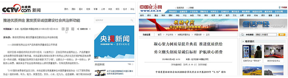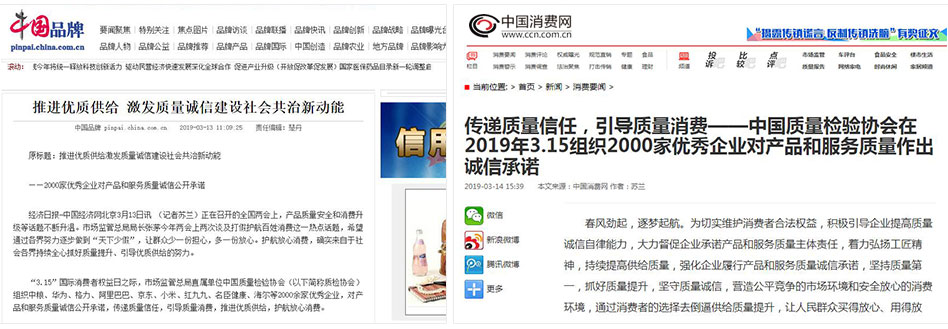 •中國消費(fèi)網(wǎng)《傳遞質(zhì)量信任,引導(dǎo)質(zhì)量消費(fèi)——中國質(zhì)量檢驗(yàn)協(xié)會在2019年3.15組織2000家優(yōu)秀企業(yè)對產(chǎn)品和服務(wù)質(zhì)量作出誠信承諾》