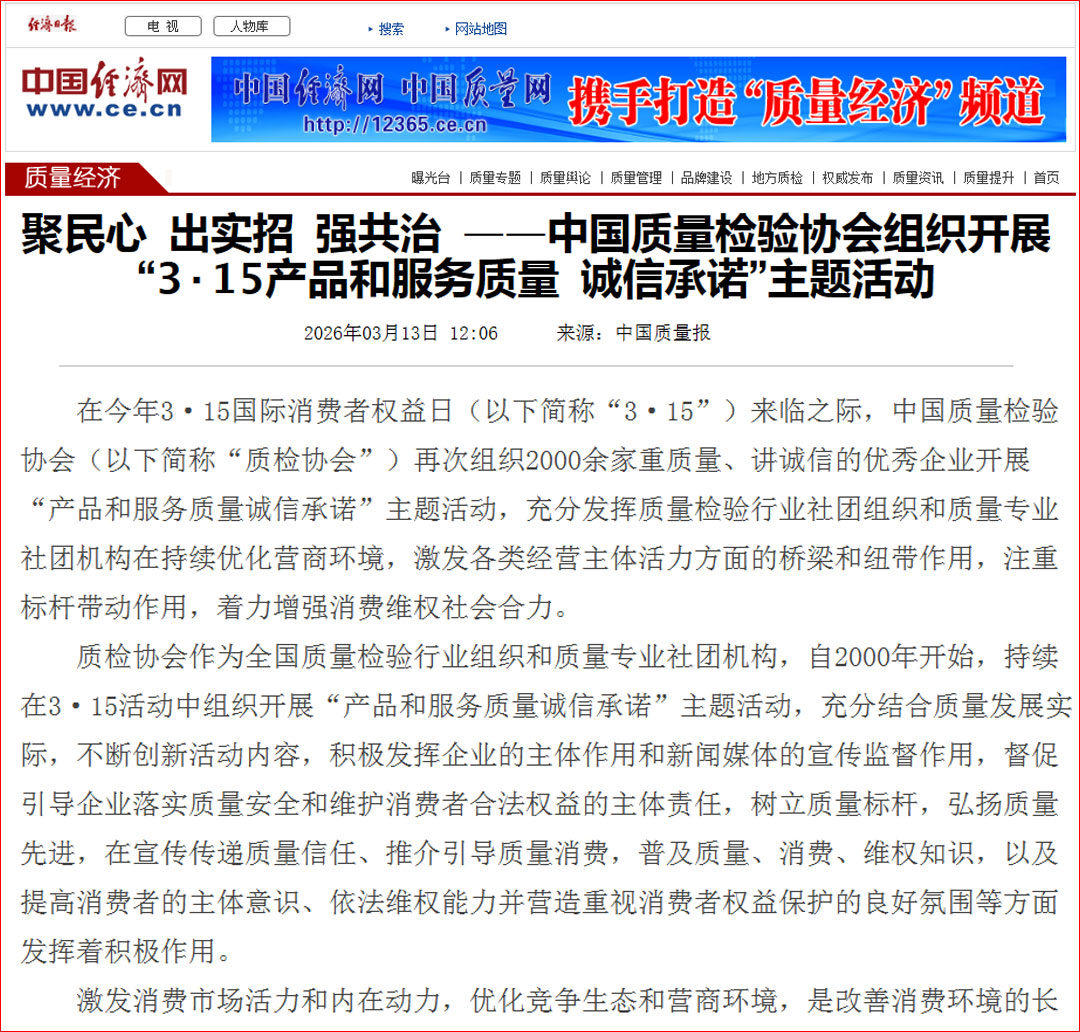 中國經(jīng)濟(jì)網(wǎng)發(fā)布:質(zhì)量誠信承諾 助力提振消費——中國質(zhì)量檢驗協(xié)會組織2000余家優(yōu)秀企業(yè)開展2026年3·15“產(chǎn)品和服務(wù)質(zhì)量誠信承諾”主題活動