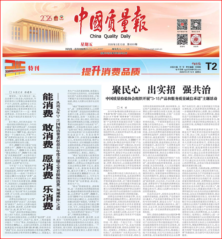 《中國質(zhì)量報》(2026年3月13日刊)發(fā)布:中國質(zhì)量檢驗協(xié)會關(guān)于組織開展2026年3·15國際消費者權(quán)益日“產(chǎn)品和服務(wù)質(zhì)量誠信承諾”主題活動的公告(中國質(zhì)量檢驗協(xié)會公告·2026年第19號)