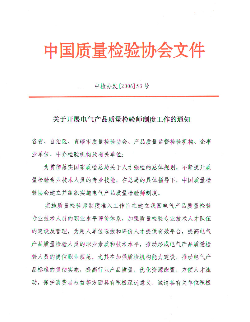 關(guān)于開展電氣產(chǎn)品質(zhì)量檢驗(yàn)師制度工作的通知