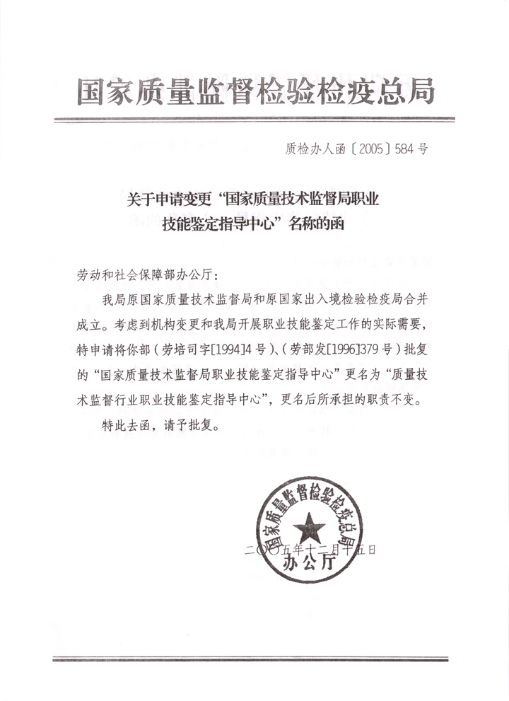 關(guān)于申請變更“國家質(zhì)量技術(shù)監(jiān)督局職業(yè)技能鑒定指導(dǎo)中心”名稱的函