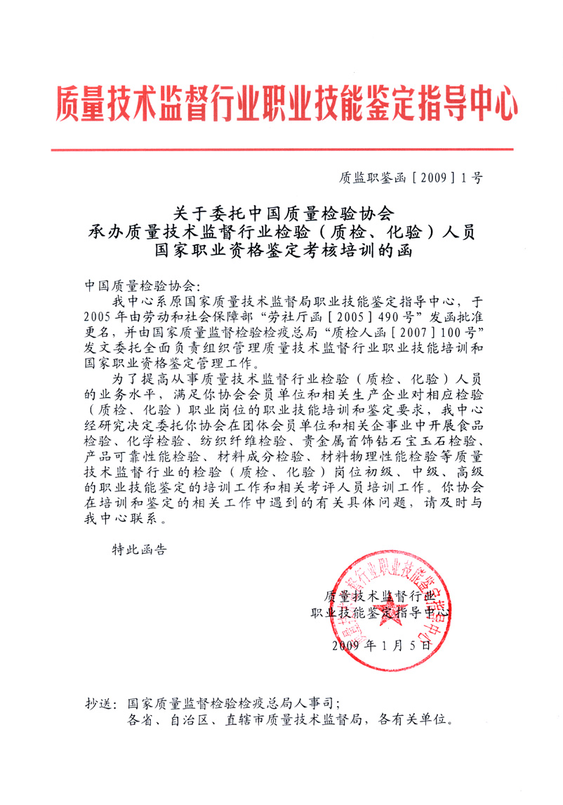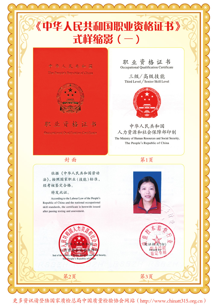 參加我會組織的培訓(xùn)并經(jīng)考試、鑒定合格者,將由(國家質(zhì)量監(jiān)督檢驗檢疫總局)質(zhì)量技術(shù)監(jiān)督行業(yè)職業(yè)技能鑒定指導(dǎo)中心頒發(fā)中華人民共和國勞動和社會保障部印制的《中華人民共和國職業(yè)資格證書》(初級、中級、高級)。《中華人民共和國職業(yè)資格證書》既是從事相關(guān)檢驗崗位人員所具備的職業(yè)技術(shù)要求和職業(yè)技能水平的資格憑證,也是用人單位技能人才評價、招收錄用和確定技能人才工資待遇的主要依據(jù),還是我國公民境外就業(yè)和輸出勞務(wù)具備法律效力公正的國家級有效證件(可應(yīng)學(xué)員要求頒發(fā)英文版本的證書)。